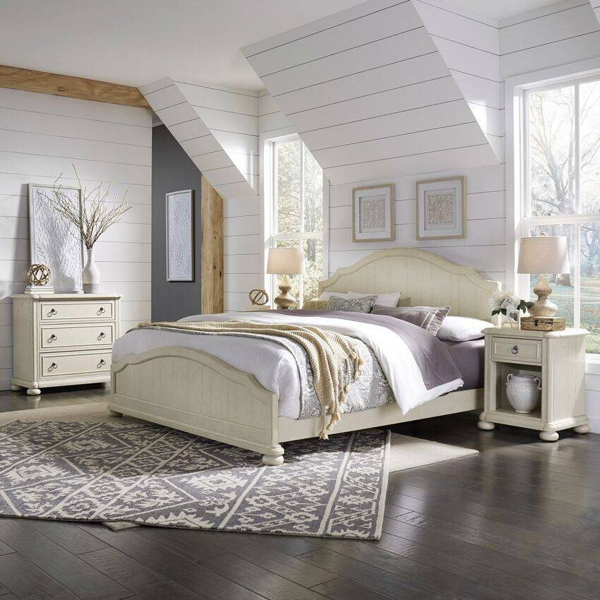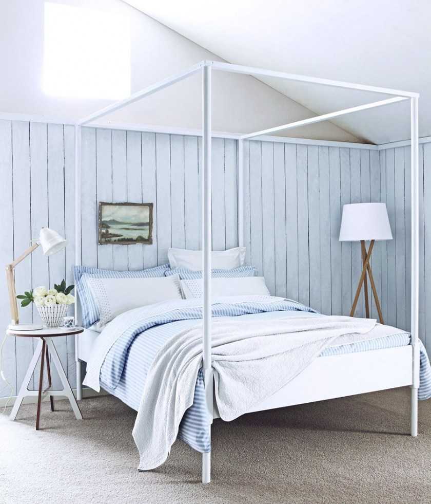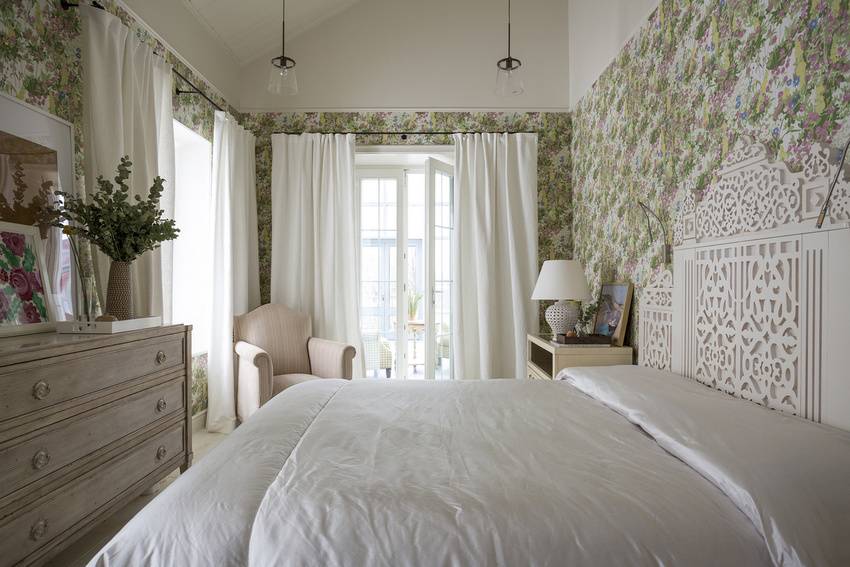 Спальня в этом стиле – неизменно светлая и уютная комната, в которой легко дышится. Мебель в спальне чаще всего белых или бежевых оттенков, а общая однотонность интерьера разбавляется узором на оконном и постельном текстиле.