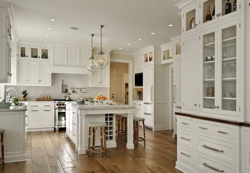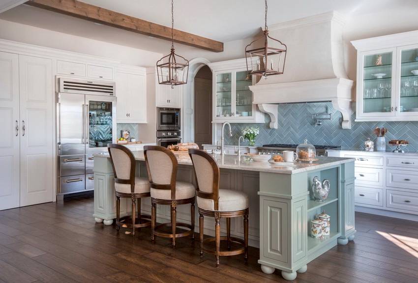 Отдельного внимания заслуживают кухни в стиле прованс – атмосферные и аутентичные. Украшением такой кухни является массивная вытяжка, зачастую являющаяся центральным элементом композиции. Только в провансе можно встретить уникальную концепцию – отштукатуренная, белая основа кухни с деревянными фасадами и рабочей поверхностью, выложенной из плитки. Еще один вариант исполнения – это классическая кухня с резными, решетчатыми или филенчатыми фасадами, окрашенными в нежные лиловые, бежевые, фисташковые или голубые цвета.