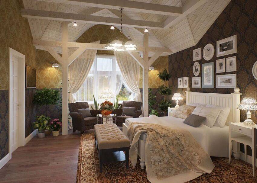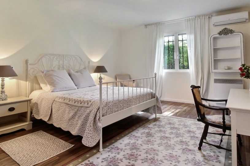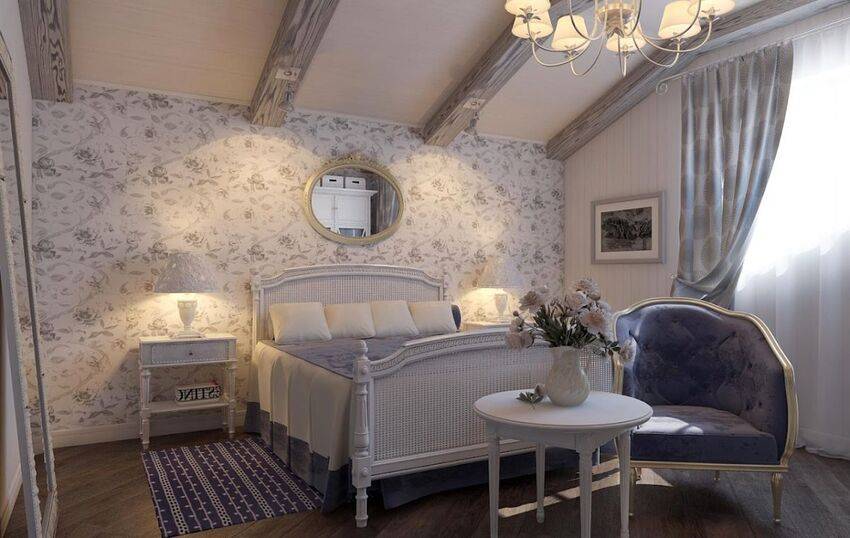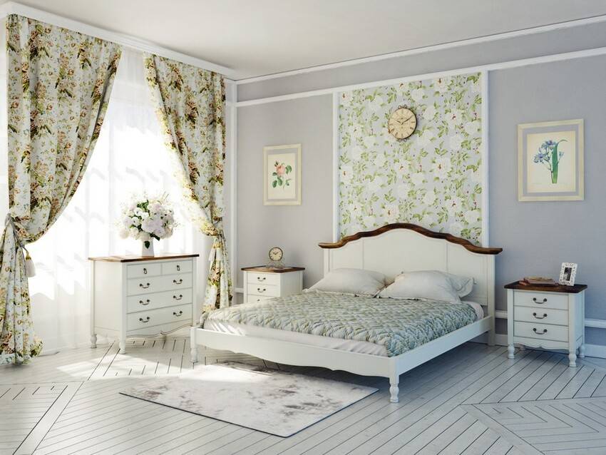 Спальня в духе прованс обычно оформлена в светлых спокойных тонах без лишних ярких деталей