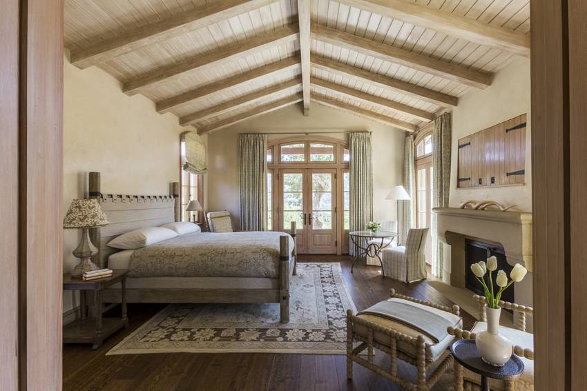 - Потолок подразумевает грубую отделку с имитацией балок.
