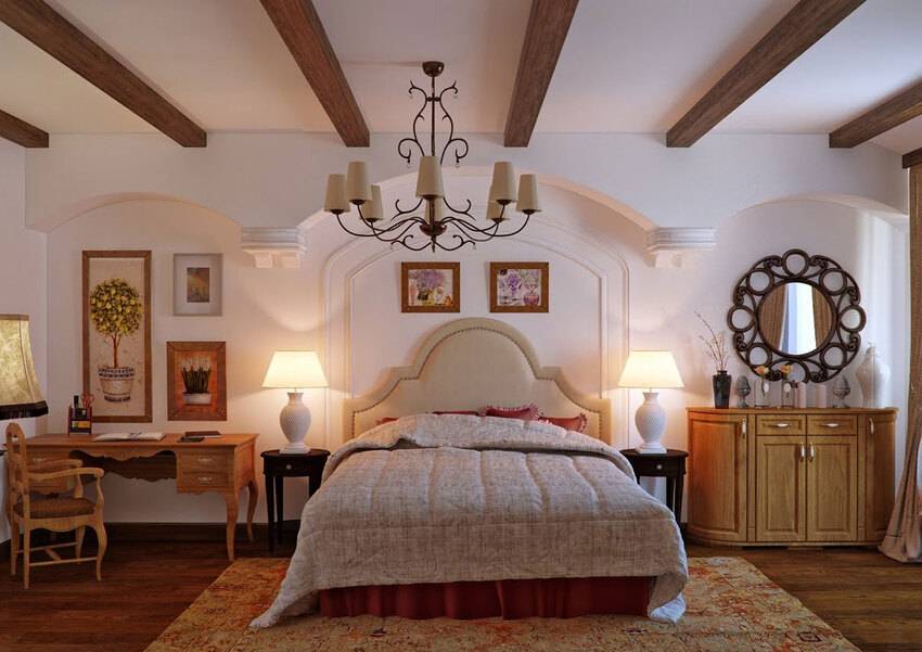 В оформлении комнат можно увидеть много кованных элементов – массивных люстр, подсвечников, подставок для цветов. В спальне стоит кованная кровать. На стенах картины. Уют обстановке придают небольшие детали – декоративные подушки, вазочки с живыми или сухими цветами. В некоторых загородных домах популярна окрашенная мебель с открытыми полочками для сувениров.