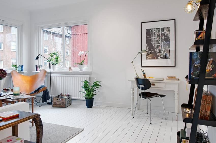 Применение комбинации цветовой палитры белых и черных тонов с поверхностями из древесины помогает составить основу скандинавского интерьера. Древесина светлых пород применяется для облицовки полов, а также для изготовления мебели. Замечательно смотрятся белые двери в интерьере квартиры. Фото примеры помогут подобрать подходящий вариант. На светлом фоне неплохо выглядят яркие крупные предметы мебели. При этом можно применить контрастные оттенки.
