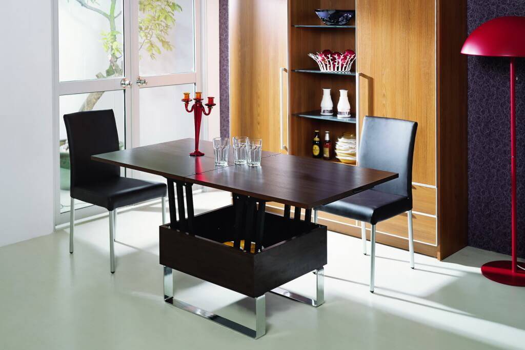 Для малогабаритного жилья вам просто не обойтись без подъёмного трансформирующегося стола. В обычном положении он представляет из себя привычный для всех журнальный стол. Однако с приходом долгожданных гостей его можно раскладывать.