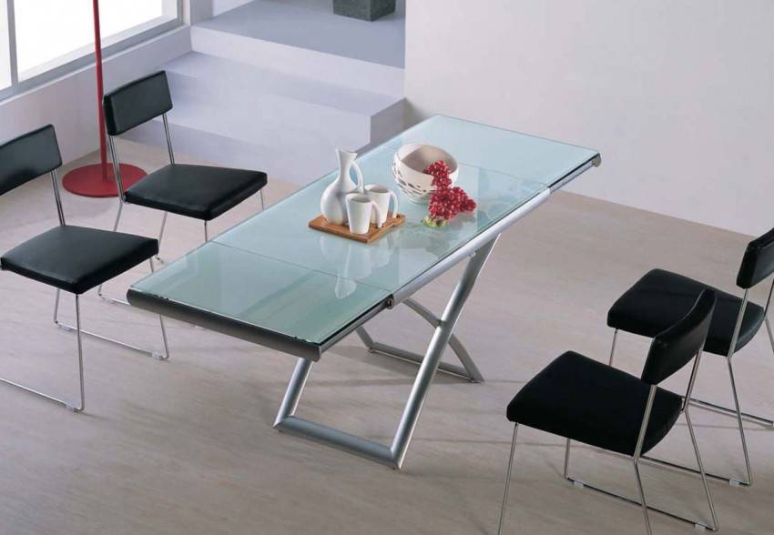 Оригинальным изобретением выступают столы-трансформеры со столешницей с матовой стеклянной поверхностью. На функциональное назначение и компактность стола подобное решение не влияет никаким образом, при этом вносит некую экстравагантность в интерьерное пространство.