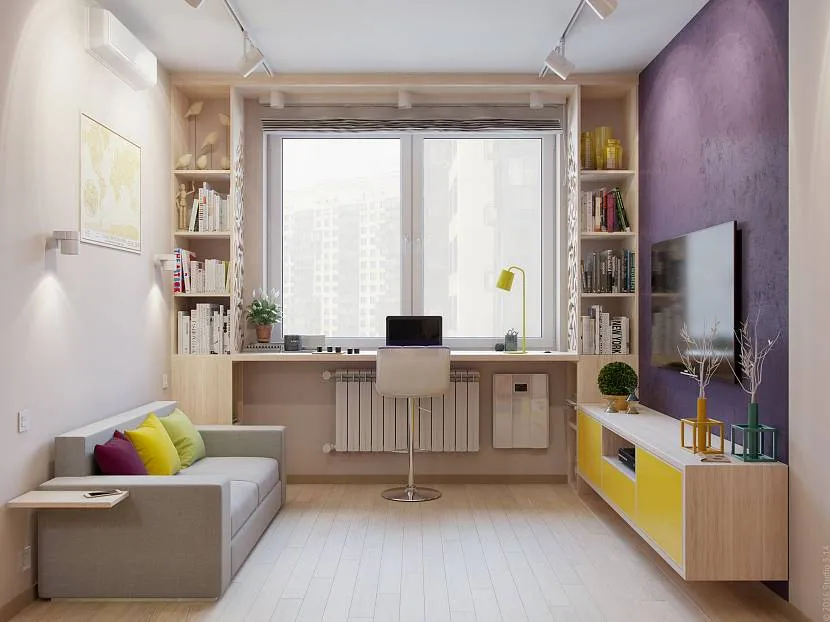 Функцию рабочей зоны выполняет широкий подоконник — этот прием позволяет сэкономить и пространство, и денежные средства.