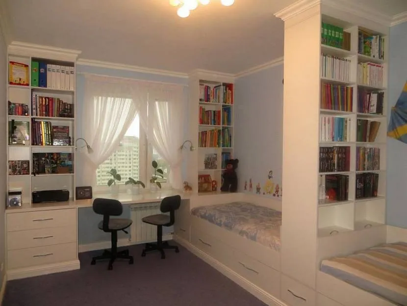 Рабочая зона для двоих, сформированная по принципу симметрии Источник design-homes.ru Комната для двоих должна выстраиваться в строго симметричном порядке, оба школьника должны иметь одинаковое пространство, одинаковое количество полок, осветительных приборов.