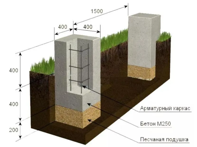 - Сечение столбов: 0,4 м (из бетона), 0,6 м (из кирпича), 0,4 м (бутовые).