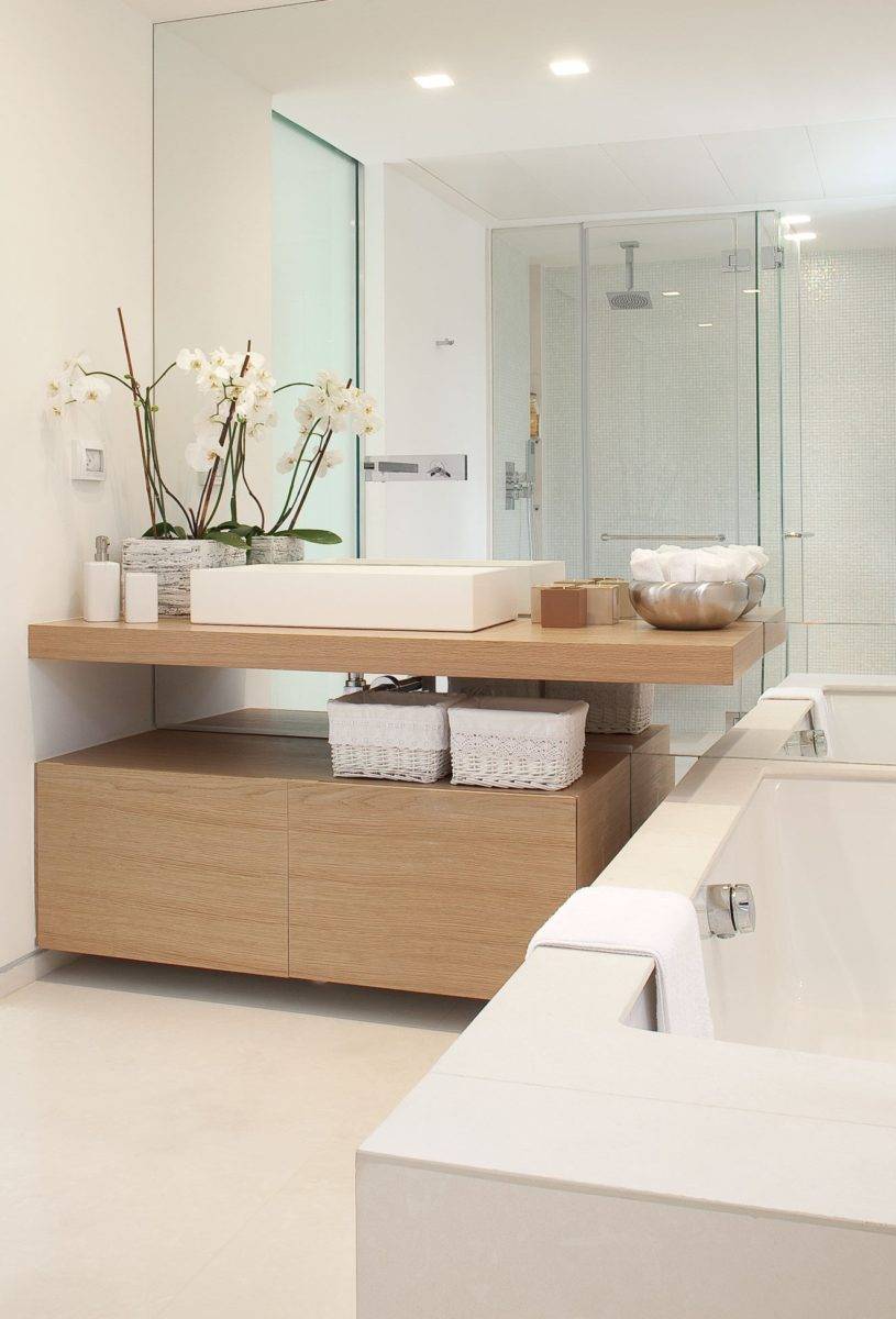 Встроенная деревянная раковина в ванной комнате в стиле модерн