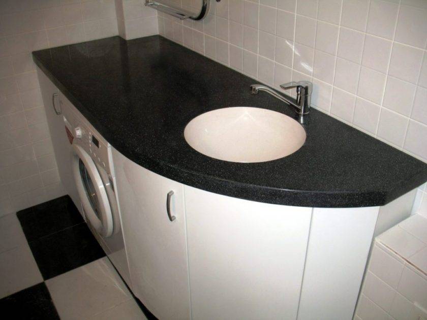 Если ванная комната не отличается большими размерами, то под малогабаритной цельнолитой столешницей можно разместить стиральную машину.