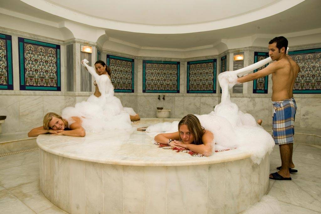 - Мыльный массаж (включает в себя растирание мыльной пены по всему телу, а затем медленное втирание). Многие эксперты настоятельно рекомендуют делать мыльный массаж при посещении турецкой бани. Действие пены полностью расслабляет мышцы и улучшает кровоток в организме.