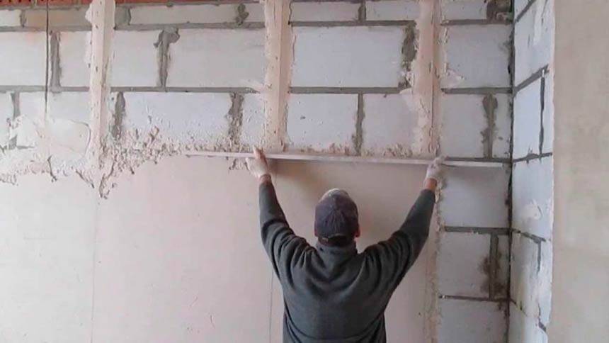 - При первом проходе правило двигают зигзагообразно. Если при этом появляются полости, незаполненные штукатуркой, добавляют раствор, и вновь проглаживают стену – теперь двигаясь по прямой.