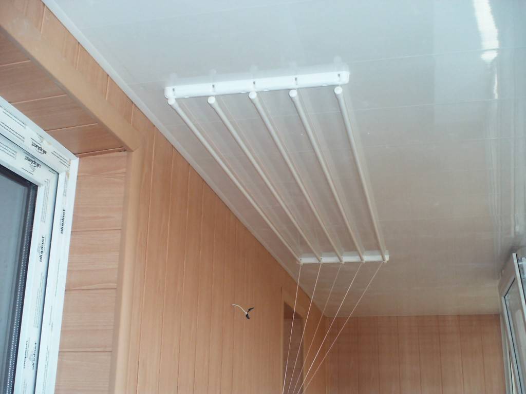 Из потолочных устройств популярны сушилки типа лиана, которыми удобно пользоваться на балконе или лоджии. Большой плюс данных конструкций в том, что высоту металлических планок можно регулировать тросами. Если расположить планки на разной высоте, одежда будет сохнуть быстрее (см. фото ниже).