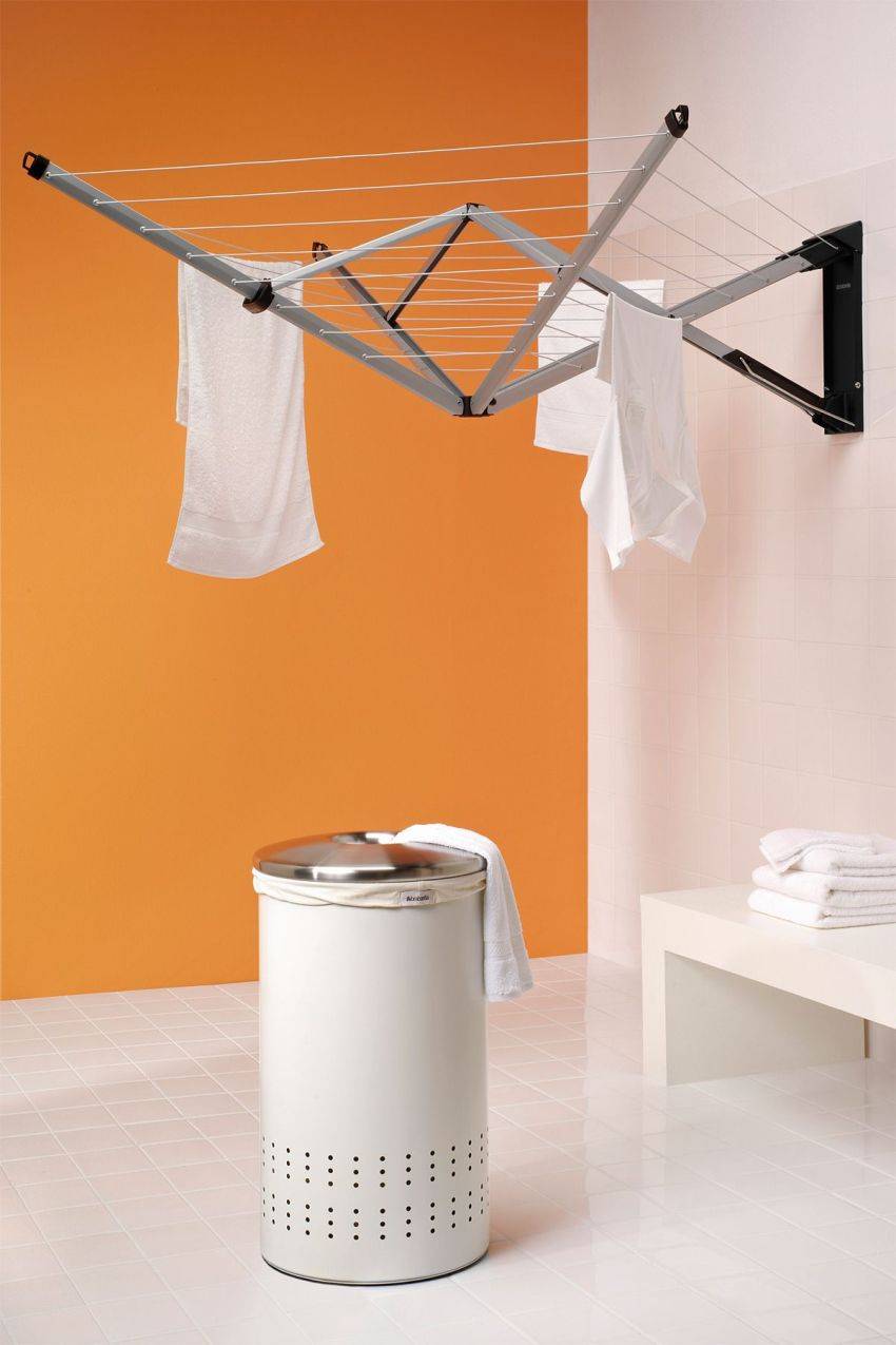 Очень удобными и популярными, особенно для небольшой квартиры, считаются настенные сушки для белья. Оригинальный и практичный вариант данного вида конструкций – это компактная складная сушилка для белья на стену. По своему строению такое приспособление напоминает те же бельевые веревки, но только более стильные и незаметные. На одну из стен вешается барабан с веревками, спрятанными внутри, а на другую – крепление. При необходимости веревки вытягиваются из барабана, а после сушки белья шнуры автоматически прячутся обратно.