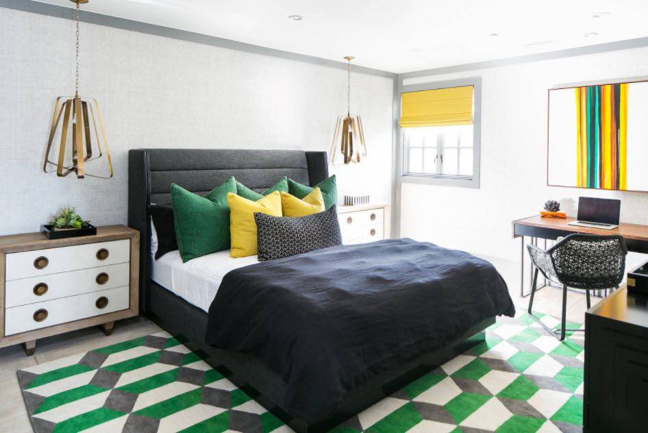 Это сочетание придётся по душе ценителям светлых и жизнерадостных интерьеров. Белый выступает универсальным фоном, а жёлтый добавляет ярких красок и бодрости по утрам. Он особенно уместен в помещении, расположенном на северной стороне, так как ассоциируется с яркими летними лучами. Тёплые оттенки серого при этом успешно приглушают его активность.