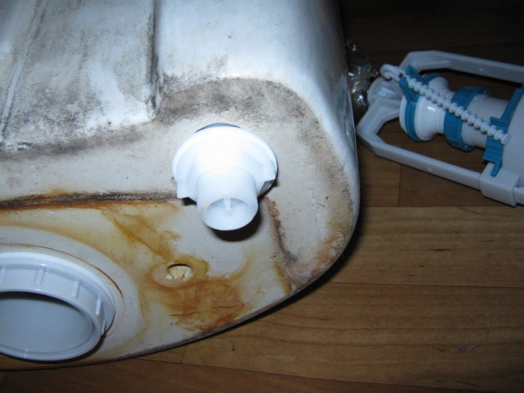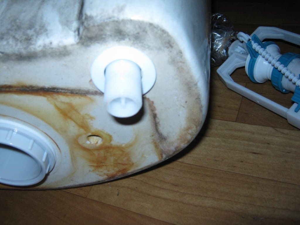 - Поломка корпуса бачка. Произведя ремонт механизма для слива, вода все равно течет, значит, поломка в корпусе емкости. Резервуар надо тщательно осмотреть на наличие небольших трещинок. Часто трещинки могут появляться снизу емкости, во время установки бачка. Их можно замазать герметиком, но лучше заменить бачок на новый, потому что любое механическое воздействие может полностью разрушить резервуар.