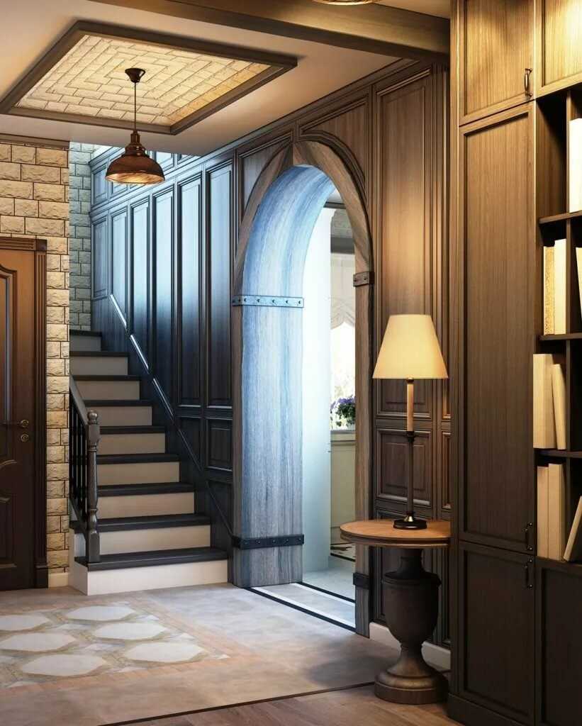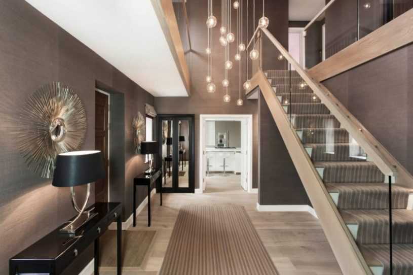 Роскошная и одновременно строгая классика предполагает сдержанную оттеночную гамму и дорогие, изысканные элементы декора. В аксессуарах и мебельной фурнитуре присутствуют плавные линии и необычные формы. Для украшения фасадов и лестничных перил применяют резьбу и красивые узоры. Обстановку дополняют торшерами и люстрами со стеклянными или зеркальными деталями.