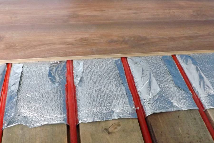 Разравнивание поверхности. База, по которой будут пролегать трубы, должна быть ровной. Если речь идет о лагах и деревянных перекрытиях, то в необходимых местах делаются специальные проемы под трубы. Теплоизоляция. Для повышения эффективности теплоотдачи, под систему кладут слой теплоизоляционного материала. Установка монтажной поверхности. Чаще всего в этой роли выступает специальный теплоизоляционный мат с бобышками, между которыми и укладывается гибкая труба. Тем не менее, осуществлять крепление можно и с помощью других подходящих средств. Прокладывание трубы