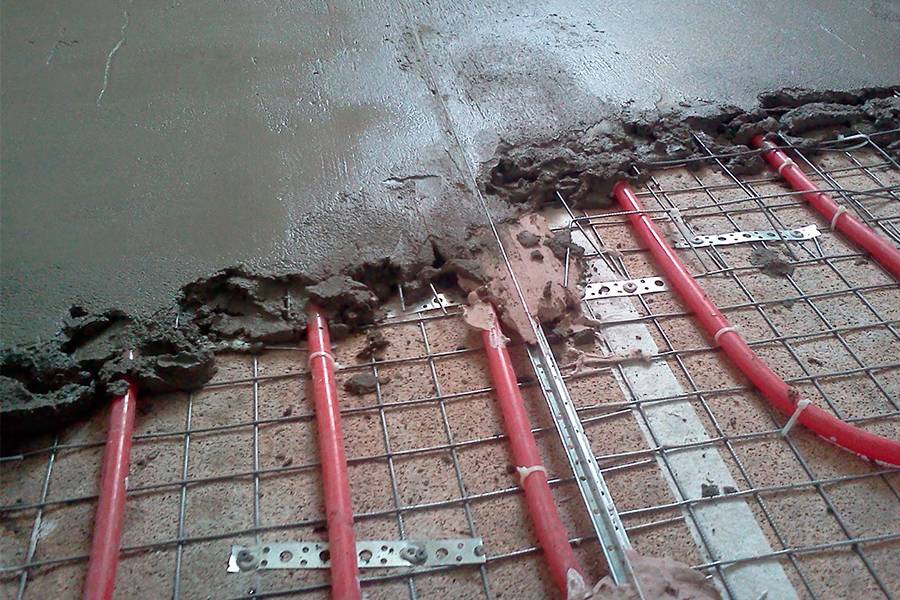 - Армирующая сетка прокладывается на расстоянии 3-4 см от уровня пола, а по ней проходят трубы (из пластика или металла).