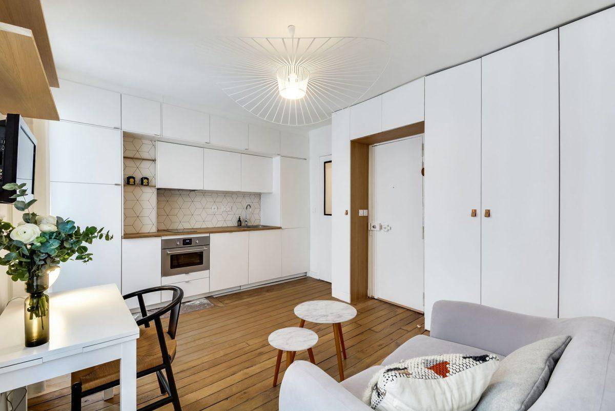 Студия «Уютная квартира», кажется, совершила невозможное и разместила в этой крошечной квартире кухню, спальную зону, гардеробную, ванную, санузел и место для синтезатора.