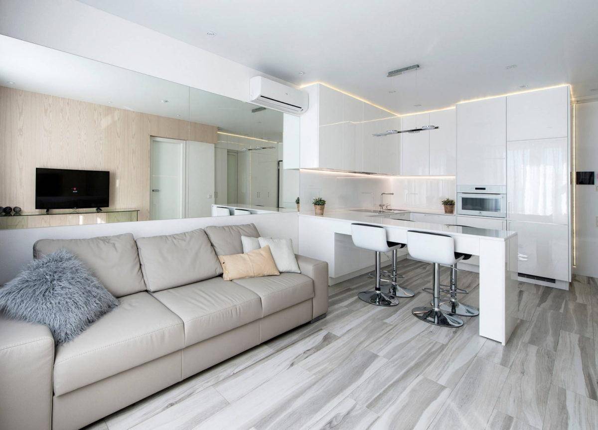 Напольное покрытие также служит инструментом выделения, например, кухонной зоны. Тут целесообразно применить крупноразмерную плитку. Для остальной территории подойдет натуральная доска или ее имитация. Мелкий паркетный рисунок пола визуально уменьшит размеры комнаты.