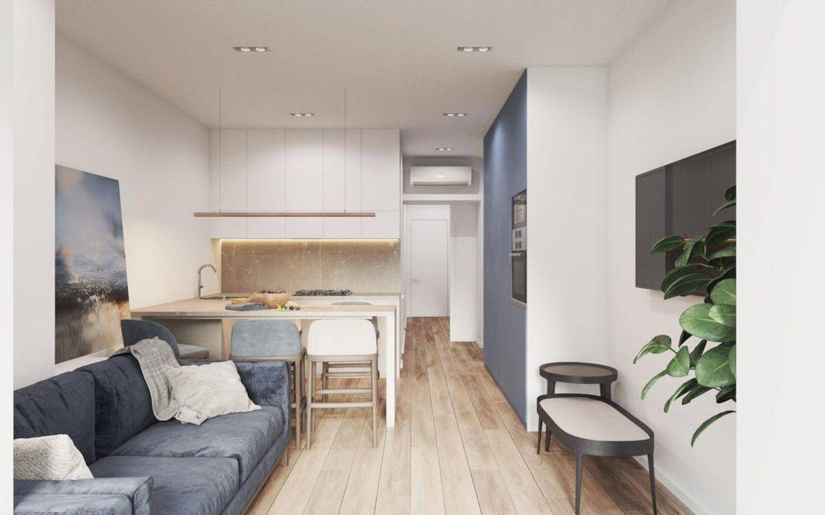 Жилая комната поделена на функциональные зоны. Сразу за входной зоной начинается кухня, оборудованная всей современной техникой. За ней располагается гостиная – диван с маленьким столиком, над ним открытые полки для предметов декора и книг, а напротив – ТВ-зона.