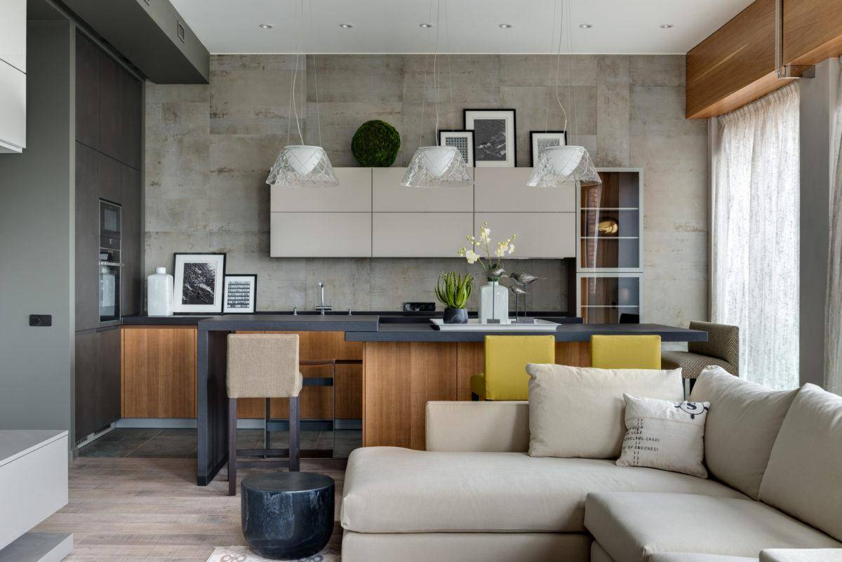 Подойдёт и белый гарнитур с гладкими фасадами и столешницей из дерева. Мягкая мебель может быть приглушённых темноватых оттенков – серого, серо-синего, хвойного. Интерьер оживят горшки с живыми растениями.