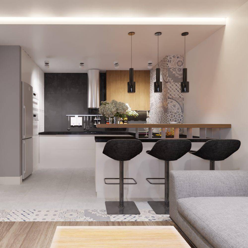 Основной цвет дизайна – белый, с добавлением серых тонов. В качестве контрастного выбран черный. Интерьер дополнен деревянными элементами – светлое дерево вносит тепло и уют, а его фактура обогащает декоративную палитру проекта.