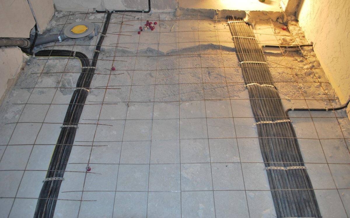 Разводку электрики и слаботочные электрокабели легко проложить в половой стяжке. К потолочным и настенным светильникам кабели протягиваются в штроблёных каналах.