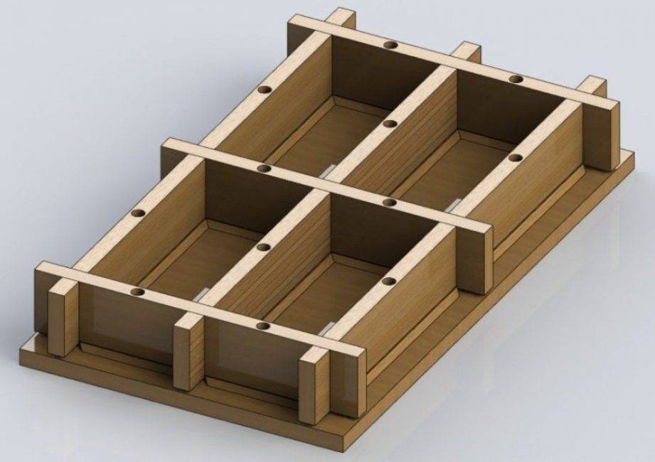 Для форм (опалубки) тротуарной плитки применяют чаще всего древесину. Более долговечны изделия из металла – извлекать из них плитку и очищать форму от застывшего раствора гораздо легче. Допускается и использование гипса – однако этот недорогой материал хрупок, и такой опалубки хватит ненадолго.