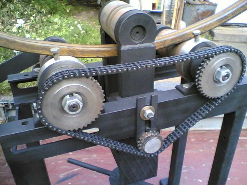 Самодельный трубогиб для профильной трубы на основе проката подразумевает, что заготовка будет уложена на боковые ролики, а сверху прижата третьим. После фиксации трубы в этом положении останется только привести посредством цепной передачи в движение валы для достижения нужного изгиба.