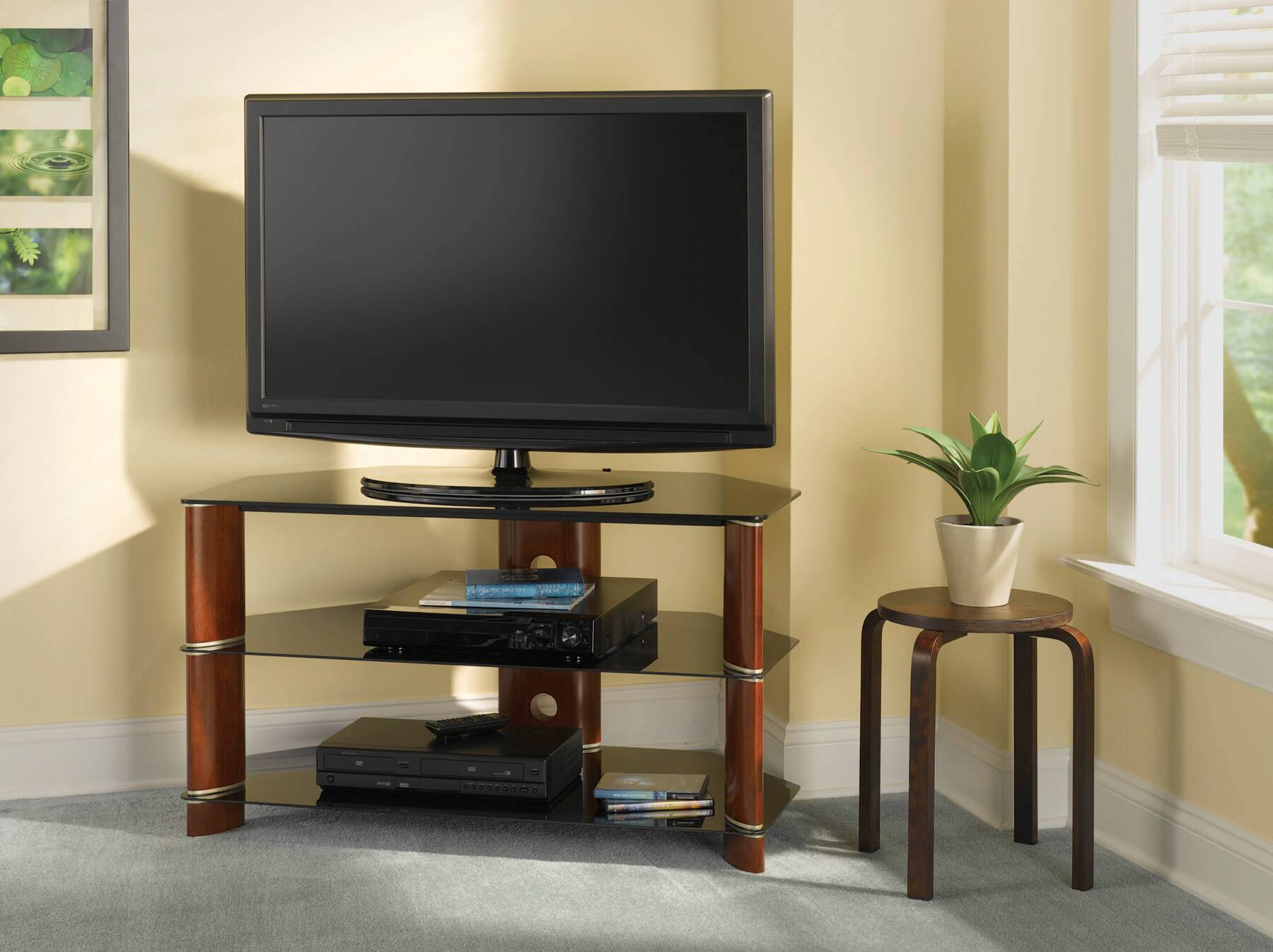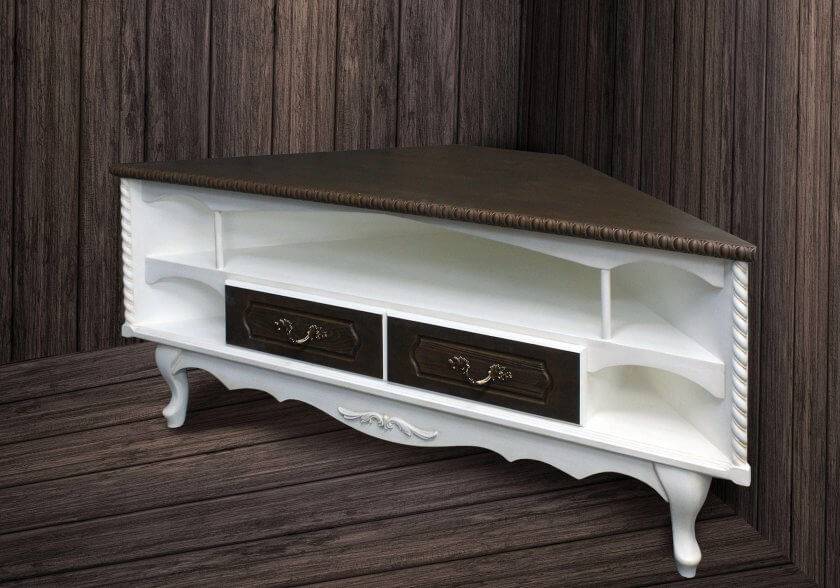 - Самый простой вариант — угловая тумба под телевизор, которая в горизонтальном сечении образует треугольник. Она считается наиболее устойчивой, но занимает значительную часть комнаты, а некоторые участки внутреннего объема создают трудности в использовании.