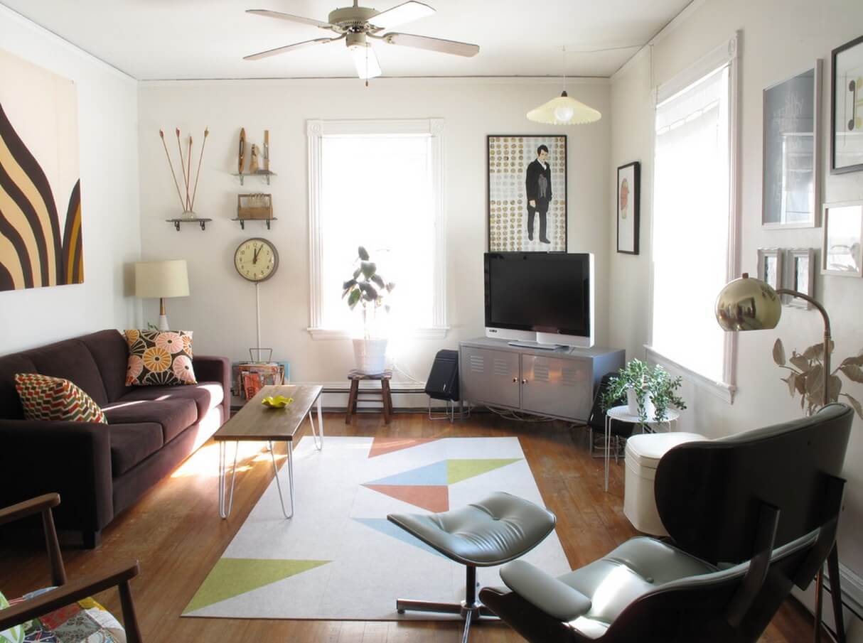 - В гостиной средних размеров (и меньше среднего) делайте выбор в пользу небольшой тумбочки, которую нужно установить вдоль длинной стены. Подставки увеличат ее функциональность.