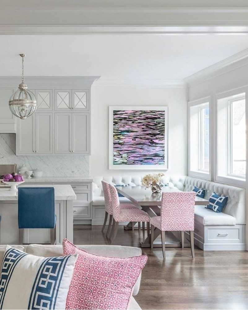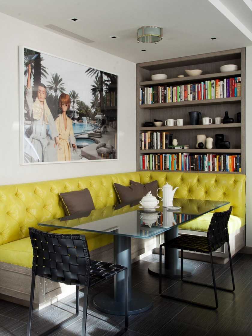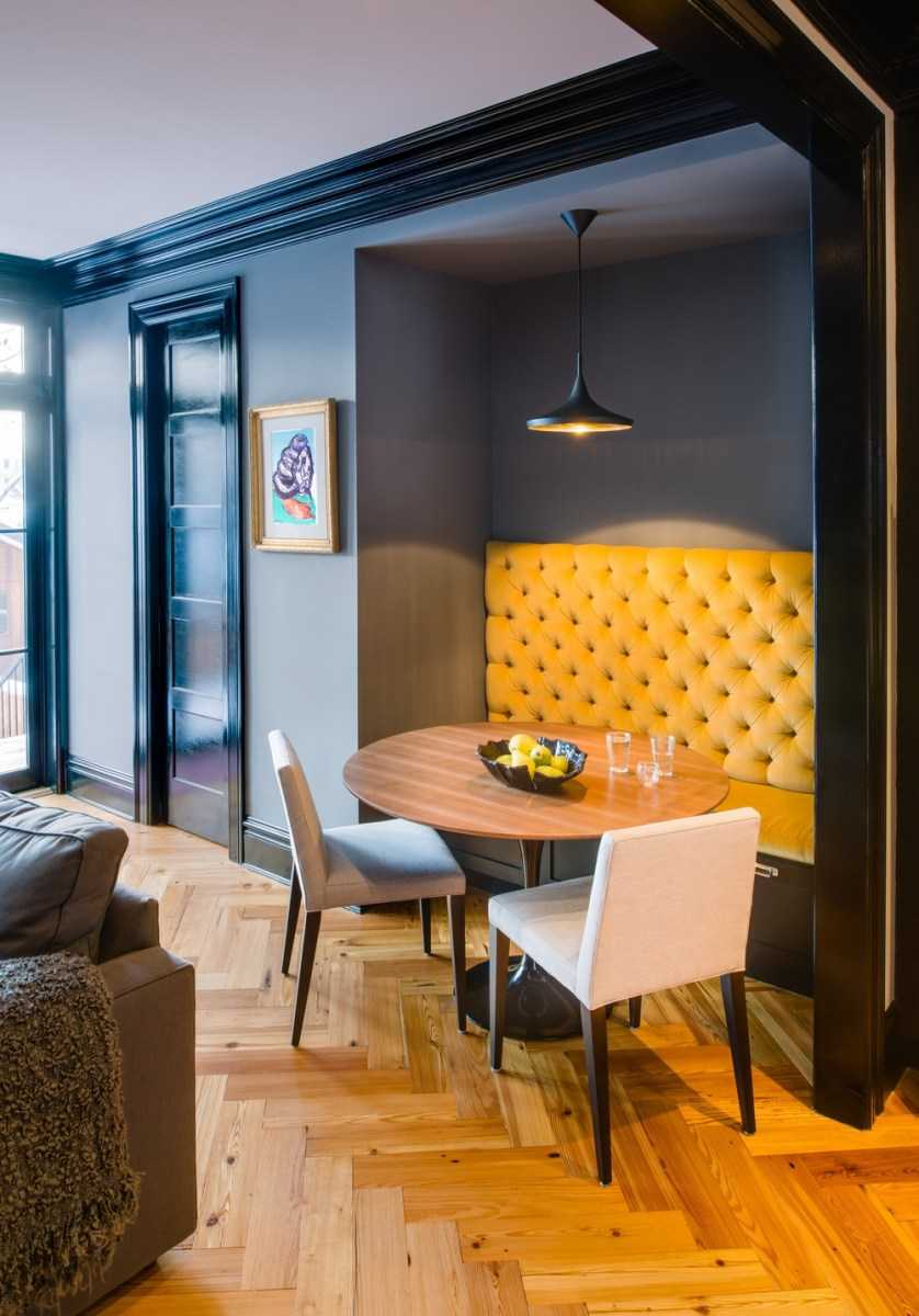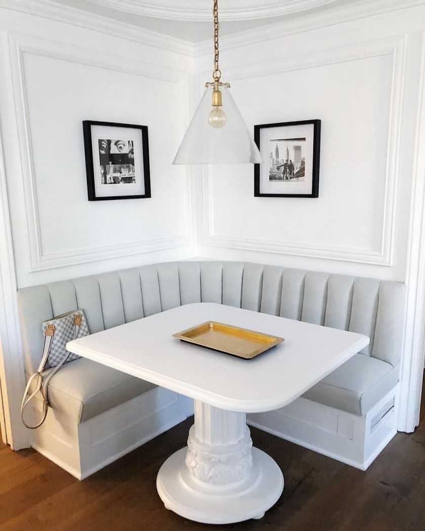 Очевиднее и проще всего – вместо стульев у обеденного стола. Но если пространство позволяет, можно поставить его отдельно. Так стол останется для основного приема пищи, а мягкий уголок – для отдыха и дружеского чаепития.
