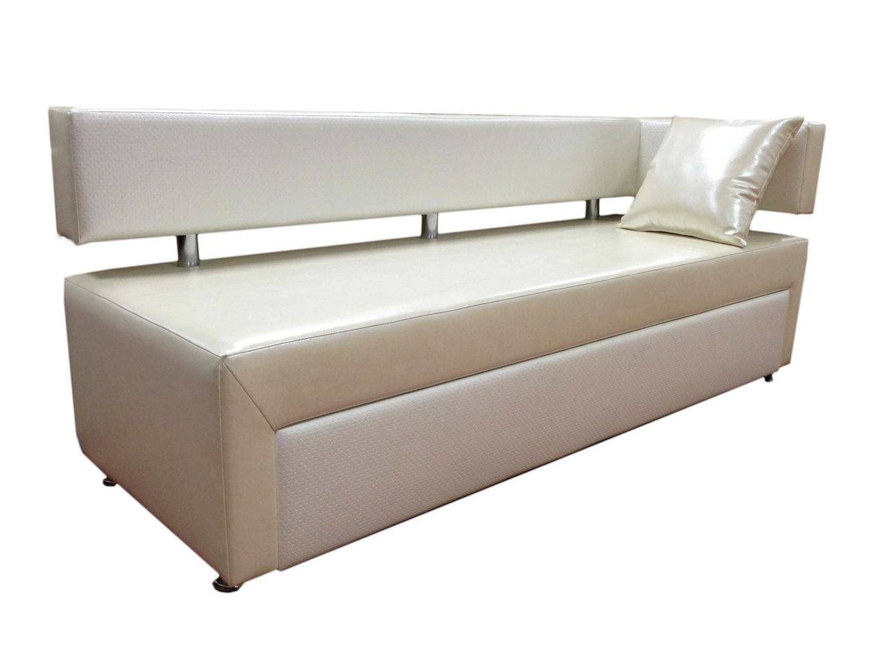 Кухонный диван с боковой спинкой. Такая модель представляет собой раскладную кушетку. Механизм раскладки – выкатной или откидной. Ширина такой кушетки начинается от 60-70 см. Хотя лежать на ней и не очень удобно, но как резервное спальное место для гостей она вполне подойдет. Спинка дивана выполняет две полезные функции: защищает стену от попадания брызг и капель, служит опорой для спины во время отдыха и приема пищи.