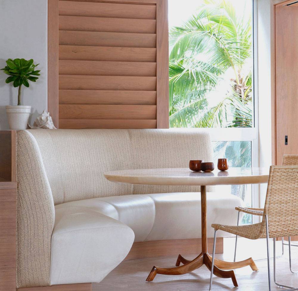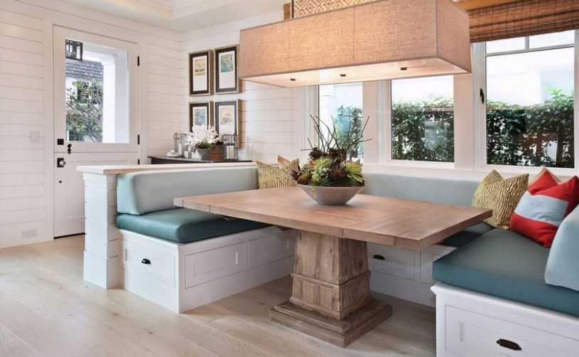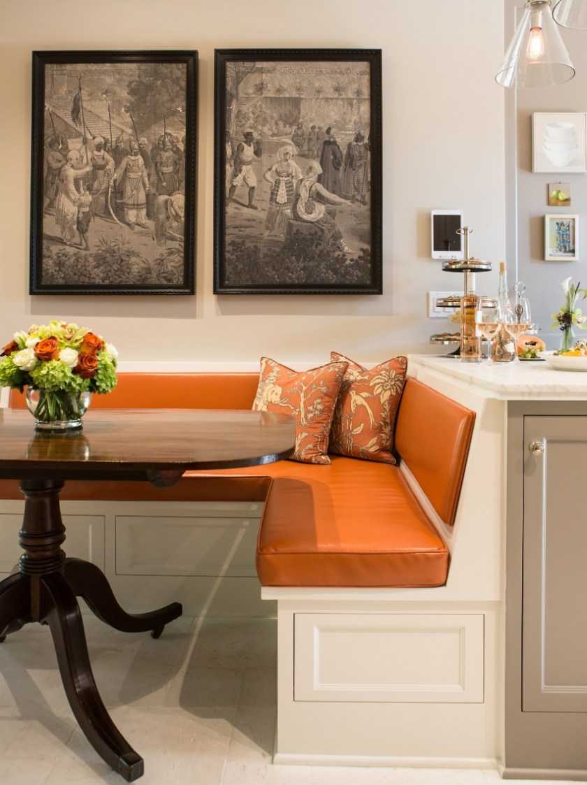 Неглубокий диван. Когда пространство кухни ограничено, оптимальным вариантом будет кухонная софа с сиденьем в пределах 50-60 см. Это позволит увеличить количество посадочных мест за столом и сохранить свободное рабочее пространство.