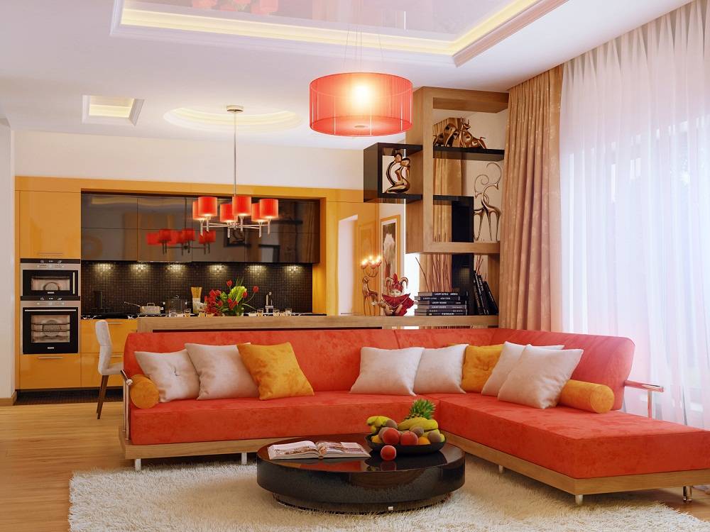 В большом помещении с помощью дивана можно успешно зонировать пространство. Самый распространенный вариант — мебель визуально отделяет место приготовления пищи от зоны столовой. При этом можно поиграть цветами, чтобы оттенок мебели соответствовал плитке или обоям в гостиной, а на кухне они кардинально отличались.