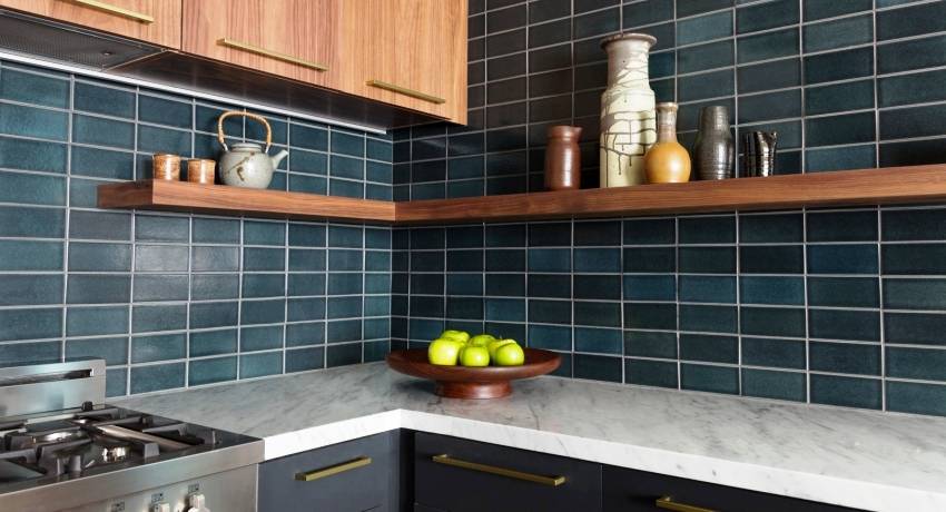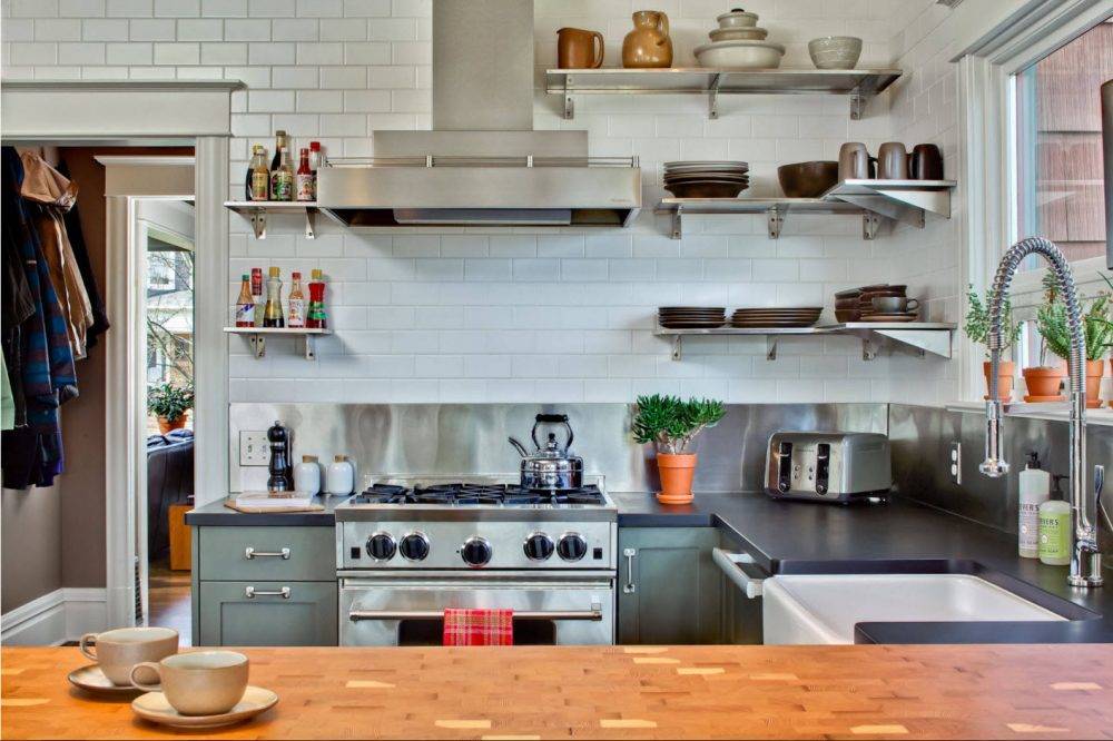 Не будут лишними полки и в кухне. Если мы говорим о квартирах, то, чаще всего, один угол занят мебельной стенкой, причем как подвесными шкафами, так и обычными.