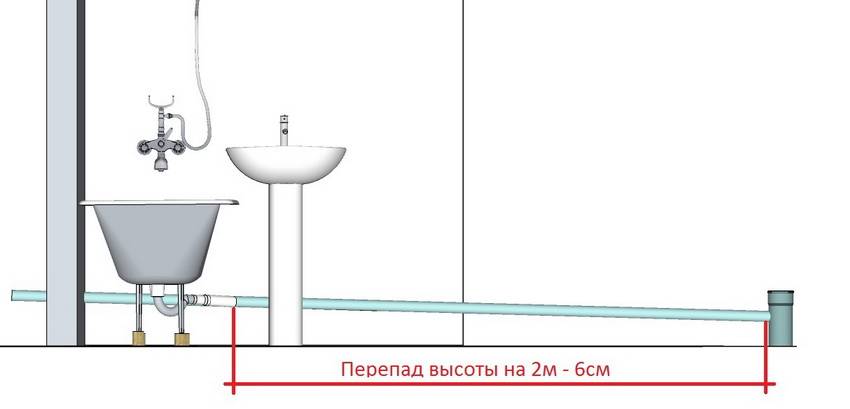 - отвод от умывальника предлагается делать из трубы диаметром 40–50 мм под минимальным углом 0,025, а лучше под рекомендуемым – 0,035;