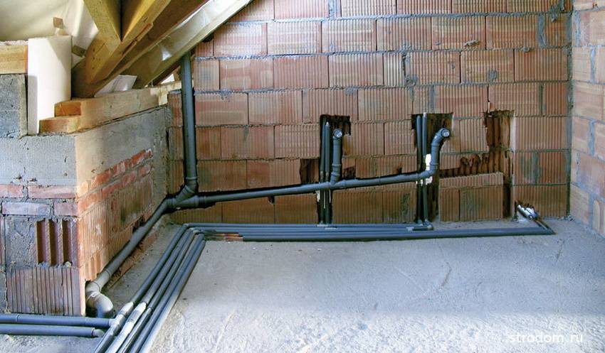 Соединенные между собой трубы крепятся к стенам с помощью хомутов. Ими же закрепляется стояк и труба, которая установлена в месте вывода из здания.