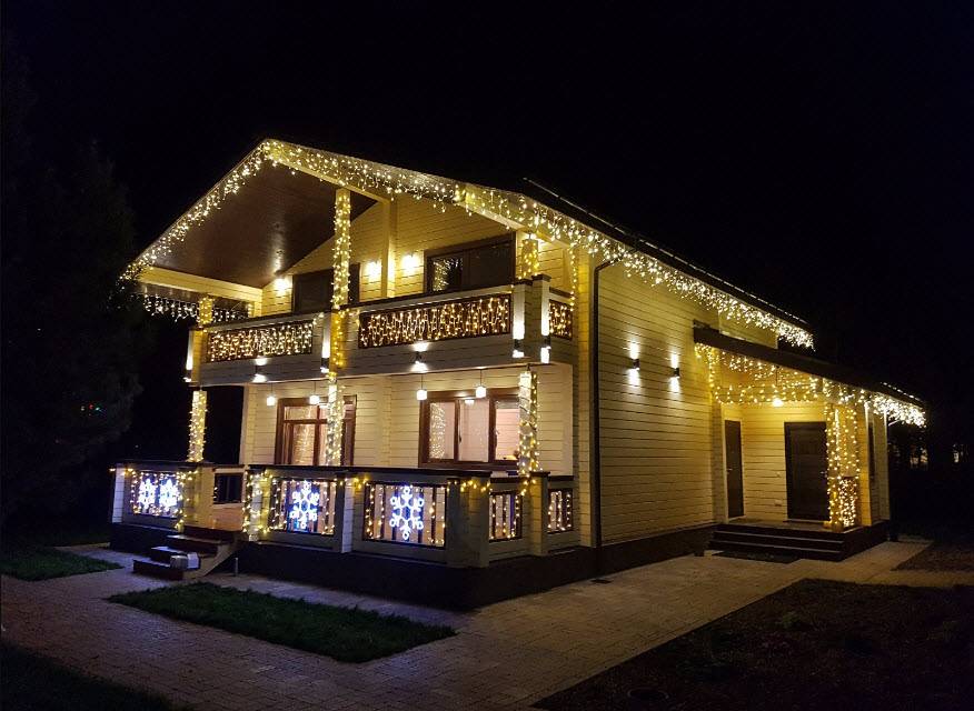 Очень красиво смотрится «бахрома». Натянуть ее можно как на скатную, так и на плоскую крышу. Целесообразно украсить гирляндой весь периметр, но при недостатке длины повесьте ее только со стороны улицы. Не менее эффектно выглядят «сосульки», гирлянды с лампочками в виде снежинок, шишек. Современный декор создаст лента дюралайт с неоновым свечением.