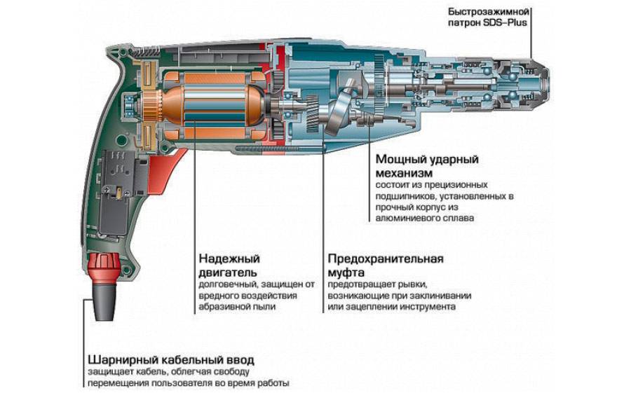 Конструктивно перфораторы могут отличаться друг от друга, хотя работу они выполняют одинаковую. Смысл в том, чтобы передавать крутящий момент от мотора на насадку. Делается это за счёт системы шестерней.