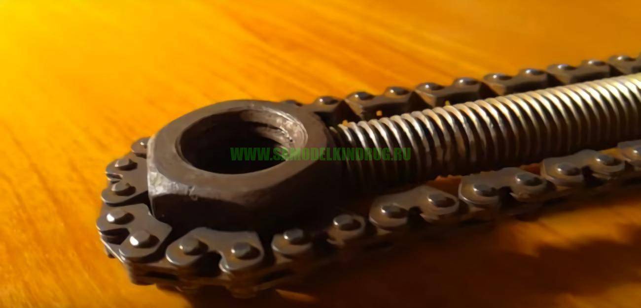 Уважаемые посетители сайта «Самоделкин друг» из представленного материала вы узнаете, как самостоятельно сделать универсальный ключ из велосипедной цепи, болта и трех гаек своими руками. Представлены пошаговые фото сборки ключа и так поехали.. Многие из Вас наверняка сталкивались с такой проблемой.. когда грани на отворачиваемой гайки или же болте немного сбиты и обычный гаечный ключ просто прокручивается не выполняя свою функцию. Решить это можно при помощи самодельного цепного ключа работающего на сжатие, тоесть чем сильнее на рукоять ключа-тем сильнее будет зажиматься цепь и тем самым открутит любую даже самую съеденную гайку или же болт.