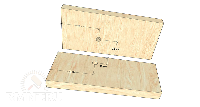 Обычная толщина панелей для сборки 16 мм, прибавим к ней 18 мм на уголок, 16 + 18 = 34 мм. Исходя из этого вычисления, делаем разметку на второй панели, сбоку отступаем те же 70 мм, а от верха 34 мм.