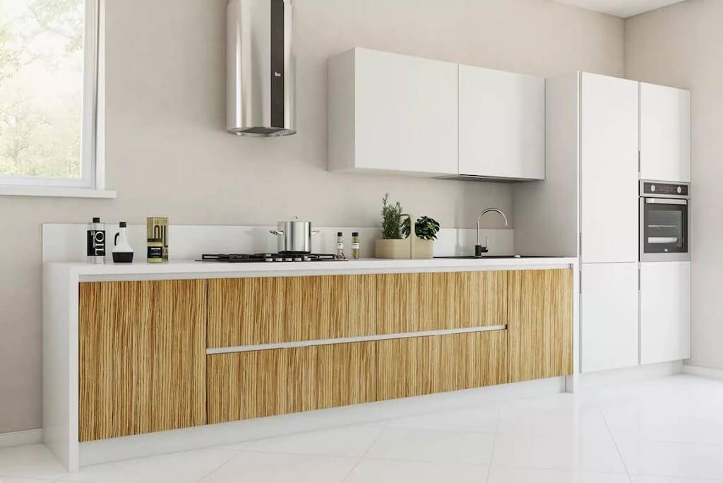 параллельная — при такой планировке мебель расставляется по двум противоположным стенам. Пространства для хранения образуется много, поэтому часто можно встретить отказ от навесных шкафов. Такая планировка сильно влияет на геометрию комнаты — визуально она становится узкой, поэтому обеденная зона переносится в другое помещение;