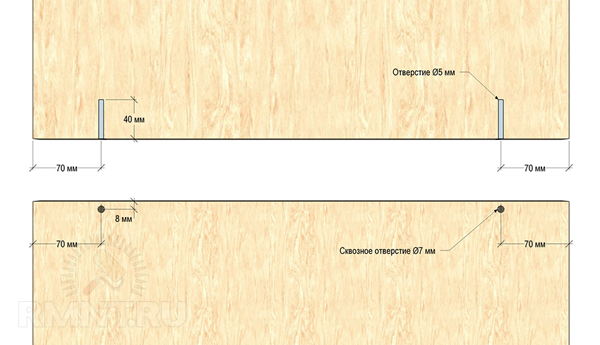 Для закручивания евровинтов в панелях сверлятся монтажные отверстия, с боков деталей сквозные диаметром 7 мм, а в торцах деталей на глубину 40 мм и диаметром 5 мм.