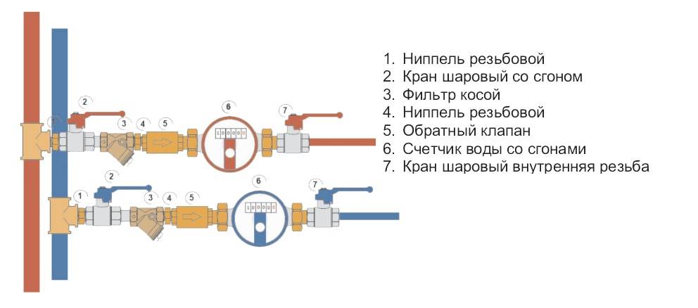 Для правильной работы счетчика, необходимо создать небольшой сантехнический узел. В его состав войдут следующие составляющие элементы: