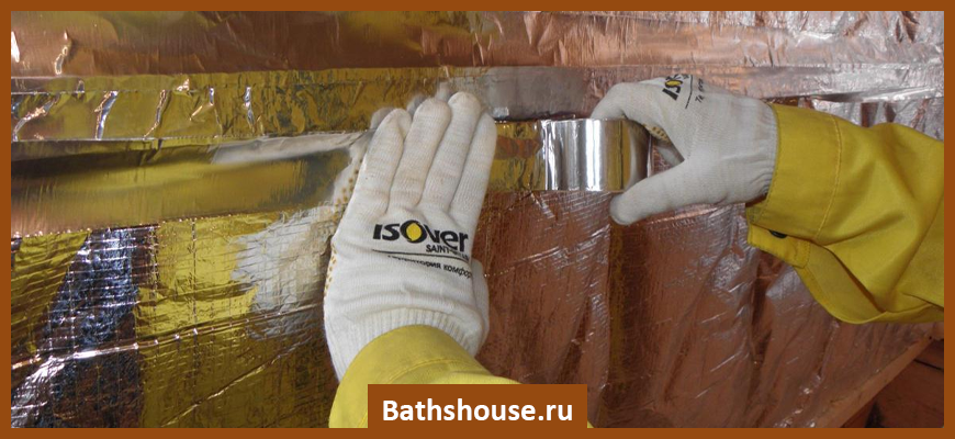 Пар, в отличие от влаги, распространяется не по конструкциям, а по воздуху. Изоляция от него должна быть более герметичной, чем гидроизоляция. Рулонный фольгированный материал раскатывается по поверхности утеплителя и брусков каркаса и проклеивается строительным скотчем.