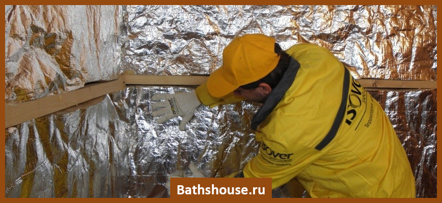 Поверх фольгированного изолирующего слоя на внутренних стенах бани может выкладываться слой минеральной ваты, которая отделяется от внутренней декоративной обивки прослойкой гидроизоляции. Получившийся воздушный зазор можно снабдить вентиляционной трубой, что предотвратит скапливание влаги в толще стены банного сооружения.