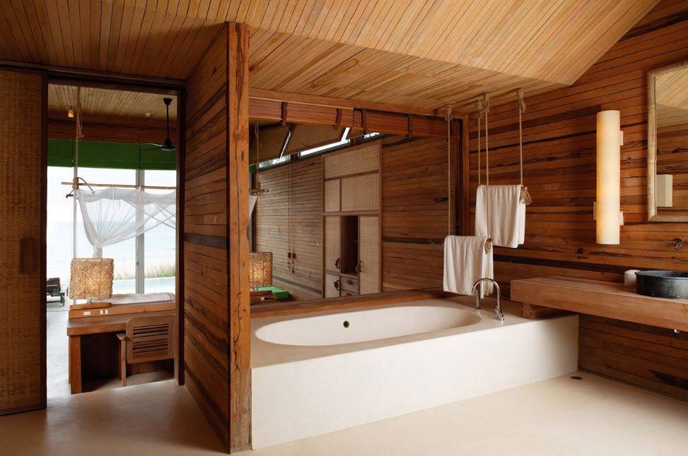 Для внутреннего оформления самой комнаты нередко используют фрагментарную отделку. То есть, одну часть ванны, где стены чаще всего контактируют с влагой, выкладывают плиткой, а другую обшивают деревом. Это позволяет красиво комбинировать разные материалы с параллельным зонированием помещения.