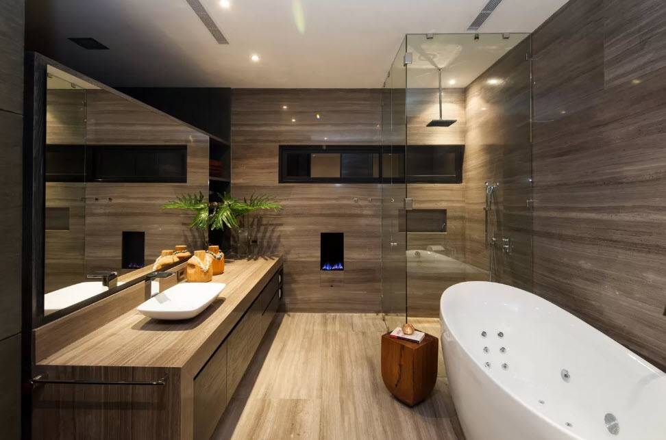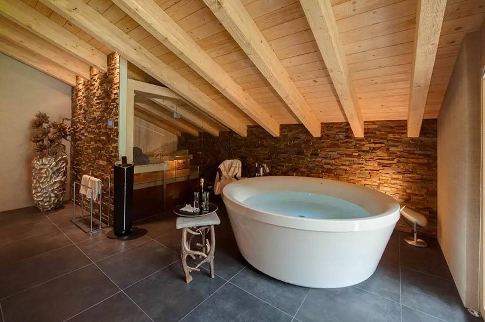 Лофт – стиль, который используется в большой ванной комнате, сочетающей в себе обилие дерева и камня, кирпичную стену и яркое освещение.